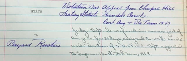 The 1947 Journey or Reconciliation, also known as the First Freedom Ride, came through Chapel Hill when activists tested a Supreme Court decision outlawing segregated seating for interstate travel. The only violence the group encountered was in Chapel Hill when the riders were attacked and followed by white taxi drivers. The riders were arrested though, for violating segregation law. A prominent local judge prosecuted the Freedom Riders as a private attorney, passionately defending Jim Crow in court as he described Black people as savages and rapists. The Freedom Riders were found guilty, and Bayard Rustin wrote about his resulting time on the chain gang.