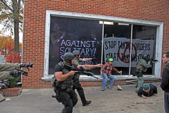 Another militaristic raid occurred in 2011 when Chapel Hill police sent a tactical unit with assault weapons to storm “anarchist” squatters in the Yates building on West Franklin Street without warning. Police reportedly pointed rifles at their faces and handcuffed two reporters. The legal result from such a dangerous flex of force was misdemeanor breaking and entering charges against seven squatters.