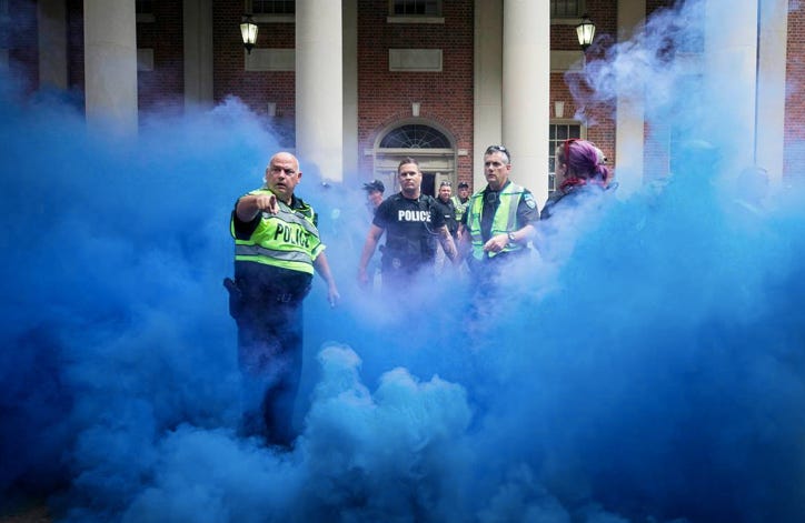 Numerous incidents surrounding protests, antiracist activists, and neo-Confederates related to the Confederate monument in recent years, both before and after Silent Sam came down. The undercover spying on students, apparent lying under oath, prosecuting charges with little to no chance of sticking, barring students from parts of campus, bicycles as weapons, smoke bombs, pepper spray, snipers on roofs, escorts and protection for white supremacists, confiscating canned goods collected by antiracists, knocking over an antiracist potluck table, arrest and termination of UNC’s assistance coordinator for student veterans who supported the campus antiracist movement, handshakes for armed white supremacists who’d threatened violence on students…